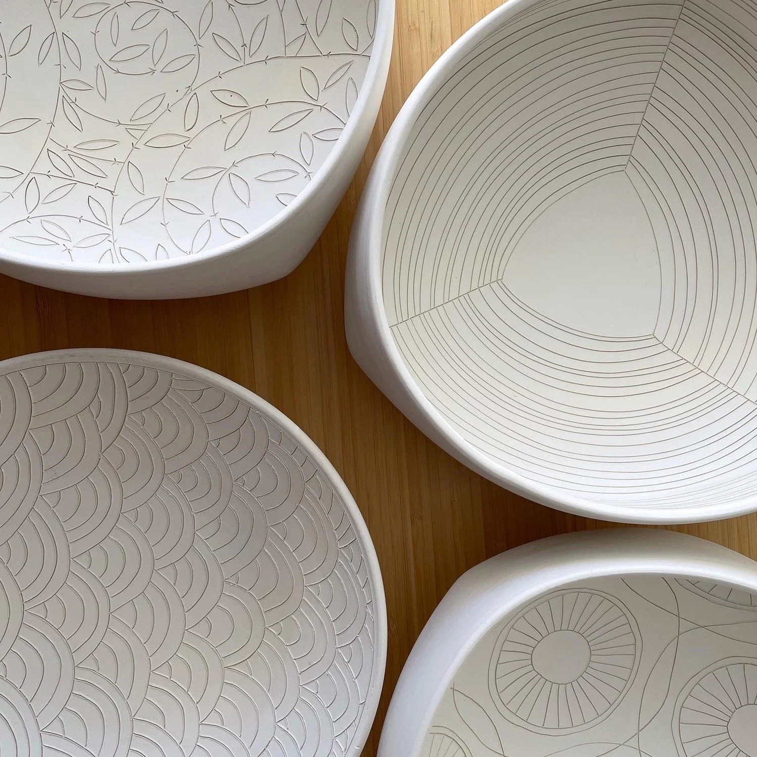 I use a cone 10 porcelain and incise a simple design with repeated elements. Using leather hard clay to draw on gives a clean line vs. bone-dry which will give a ragged line.